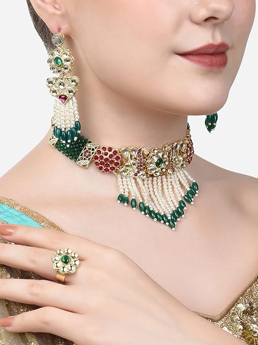Poojavi Pink & Green Peacock Inspired Kundan Choker Necklace Earring & Ring Set For Women