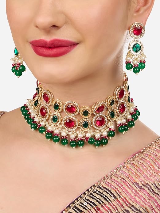 Poojavi Pink Green Stones Beads Diamonds Choker Necklace & Earring Set For Women