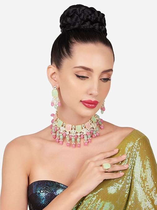 Poojavi Pink Green Stones Beads Kundan Choker Necklace Earring & Ring Set For Women