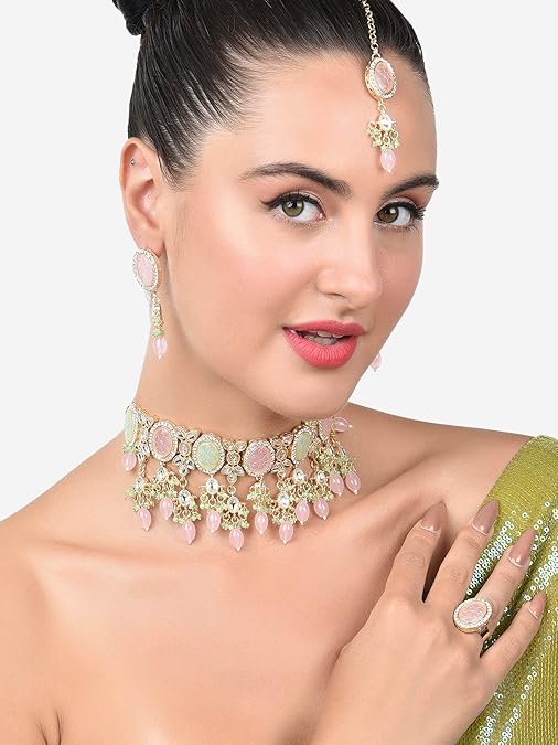 Poojavi Pink Green Stones Beads Kundan Necklace Earring Ring & Maangtikka Set For Women