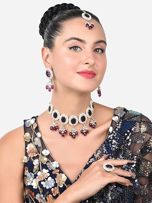 Poojavi Purple Stones & Beads Choker Necklace Earring Ring & Maangtikka Set For Women