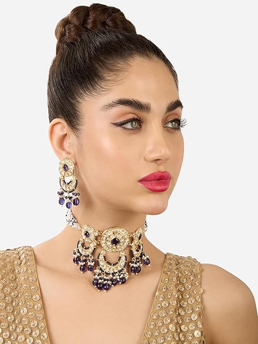Poojavi Purple Stones Multistrand Beaded Kundan Choker Necklace & Earring Set For Women