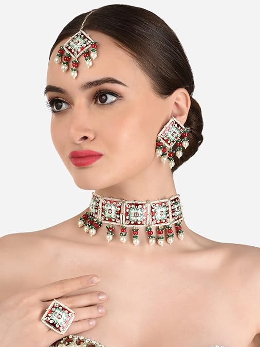 Poojavi Red & Green Meenakari Floral Choker Necklace Earring Maangtikka & Ring Set For Women