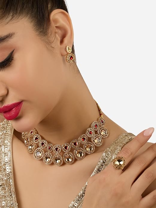 Poojavi Red Stones Dazzling Austrian Diamonds Embellished Necklace Earring & Ring Set For Women