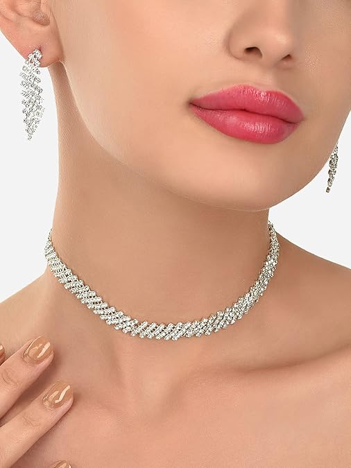 Poojavi Silver Tone Dazzling Austrian Diamonds Necklace & Earring Set For Women