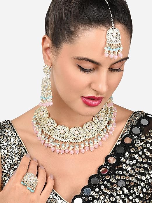 Poojavi Turquoise Blue & Pink Beads Drop Kundan Choker Necklace Earring Maangtikka Ring Set For Women
