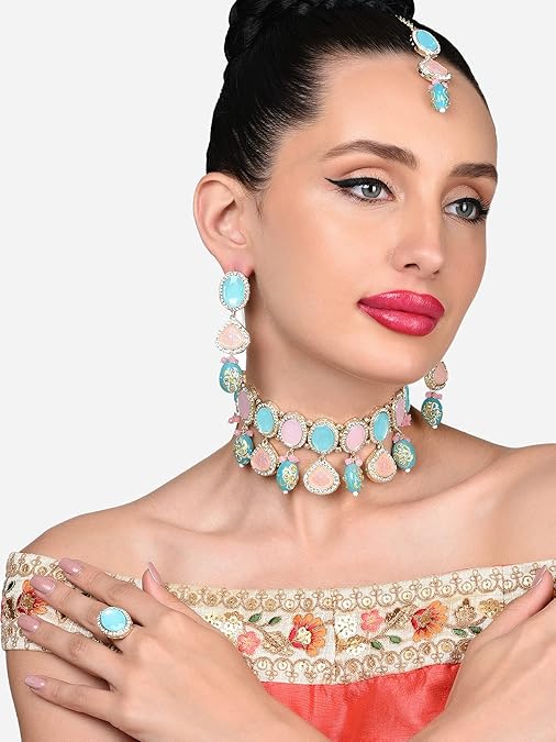 Poojavi Turquoise Blue Pink Ethnic Choker Necklace Earring Maangtikka Ring Set For Women