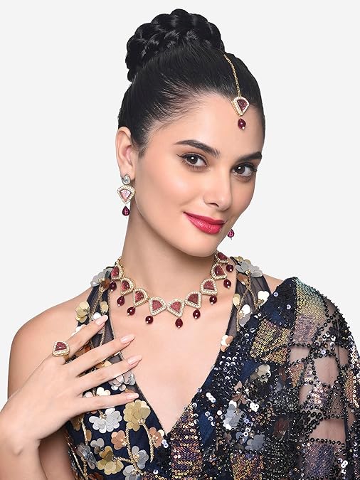 Poojavi Wine Colour Artificial Stones & Beads Ethnic Choker Necklace Earring Ring & Maangtikka Set For Women