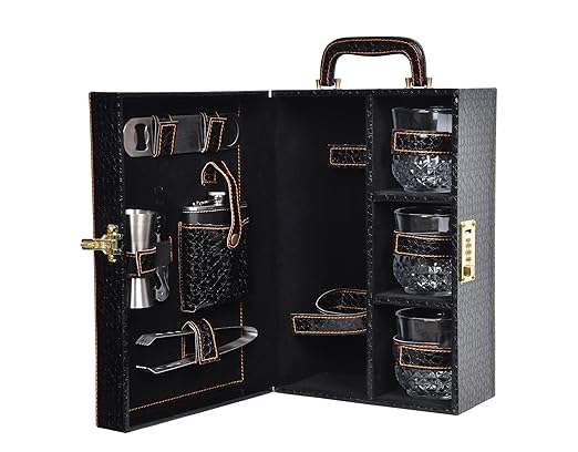 Print Black Premium Bar Set With Whiskey Glasses | Portable Leatherette Set for Picnic, Travel, and Car