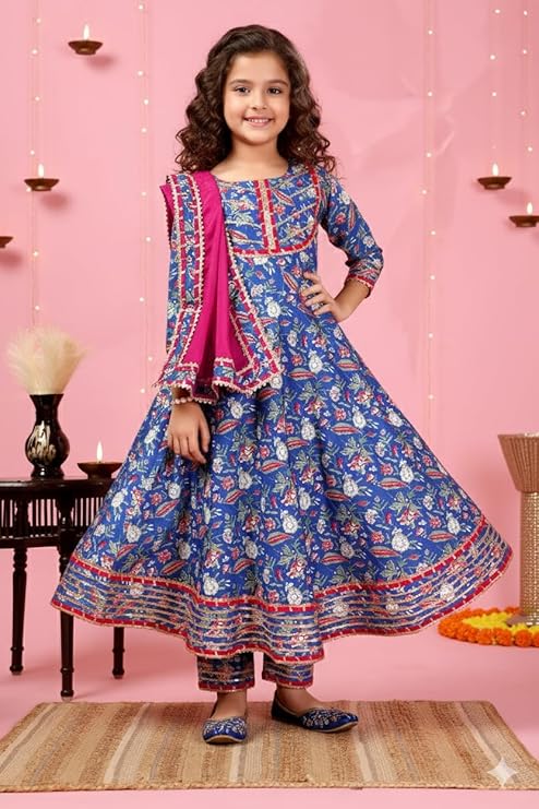 Pattern: Designed with a beautiful floral print that adds a traditional yet lively look to the outfit. The floral motifs give the set a festive appeal while maintaining a youthful and graceful vibe for young girls.