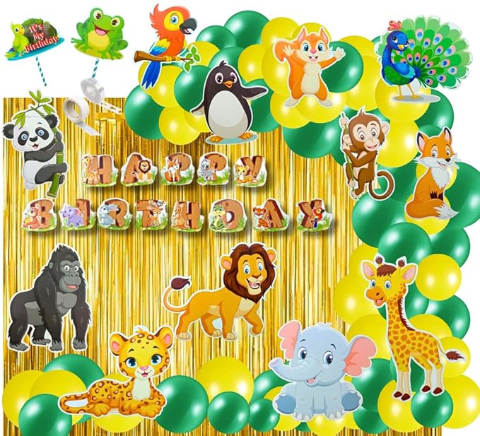 ?Package includes 1 happy birthday animal banner (13 single pcs), 12 pcs animal figure cutouts, 2 pcs animal props, 1 pc animal cake topper, 2 pcs gold curtain, 25 pcs green metallic balloons, 25 pcs yellow metallic balloons, 1 pc glue dot (100 pcs), 1 pc balloon arch.