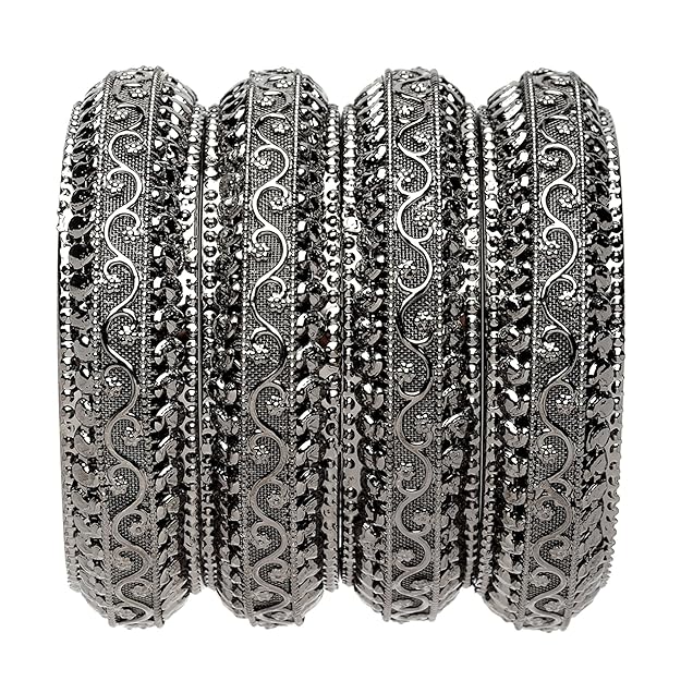 What You Get:- Set Of 4 Oxidised Plated Classic Intricate Textured Bangles, secured with Slip-On closure.