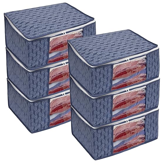 Set of 6 Non-Woven Printed Saree Cover/Cloth Storage/Organizer with Transparent Window (Navy Blue), 33.5 x 22 cm