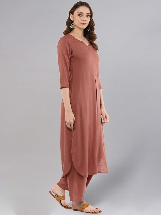 Solid Straight Brown Kurta Set for Women with Palazzo 3/4 Sleeve, Round V Neck Designer Kurta with Palazzo Pant Set