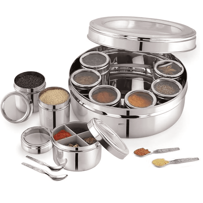 Organized Spice Storage: Comes with 9 inner containers (8 small + 1 large with partition) with individual lids to prevent mixing, keeping all your masalas in one place.