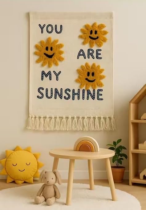 ?? Cheerful Sunshine Design: Features a woven ?Hello Sunshine? quote with sun motif in warm cream and yellow tones to brighten up any wall.