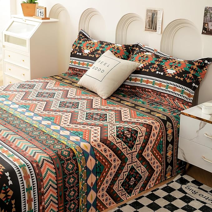 Tc Bedsheet for Double Bed Queen Size 240Tc Satin Finish, Microfiber Double Bed Bedsheet, 225X250Cm with 2 Pillow Covers, Beige & Black, Aztec | Perfect for Festive Gifting