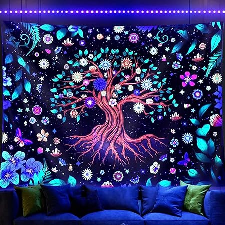 UNIQUE DESIGN AND HD PATTERN: Beautiful luminous UV tapestry design elements include fantasy tree of life, colorful flowers, beautiful butterflies and green plants, printed with advanced HD printing technology, the pattern is high definition. Make your room or dormitory full of beauty, mystery and psychedelic feeling.