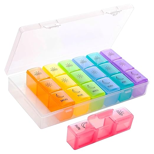 7 Day ? 3 Times a Day Design ? Convenient 21 slots (morning, noon, night) to manage your daily medicines, vitamins, and supplements without missing a dose.