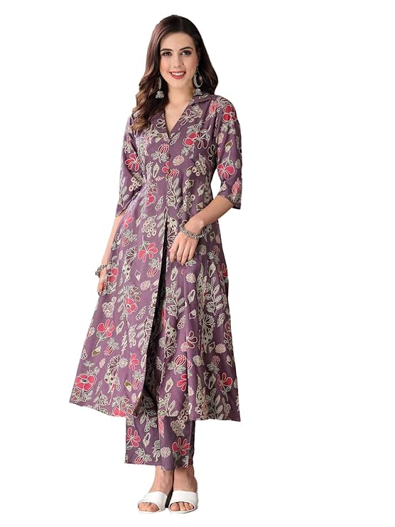 Mauve floral printed rayon front slit kurta with shirt collar, buttons on yoke and printed pant