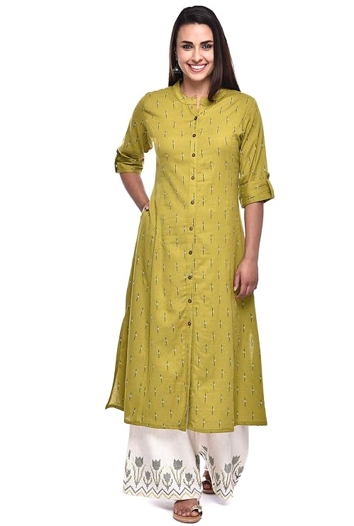 FEATURES & EXCELLENT FITTING :- KURTI :: Sleeves :-: 3/4th Fold-up Sleeve, Pattern : Ikat Printed, Chinese Collar with V Neck, Buttoned are fixed Not Openable, PALAZZO :- Style :: Matching Printed Palazzo , Length : 38-39 Inches , Long Flair , Closer Type :: Drawstring