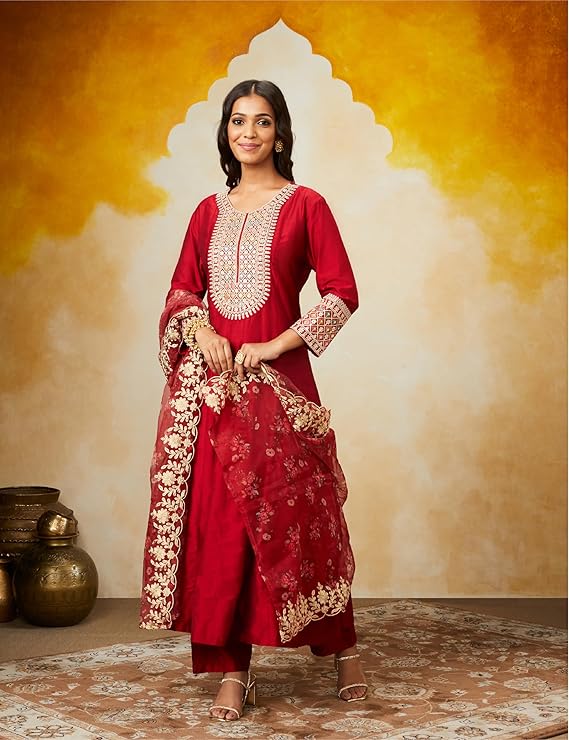 PRODUCT DETAILS: 3-piece set featuring long length Anarkali kurta with embroidered yoke, 3/4th sleeves, and pocket, paired with straight-fit pyjama and printed organza dupatta finished with scallop edge zari Dori embroidery.