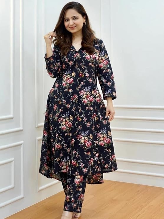 Elegant Kurta Sets for Women: This beautifully designed kurta set for women features a vibrant floral print on soft, breathable rayon fabric, ensuring an effortlessly chic and elegant look.