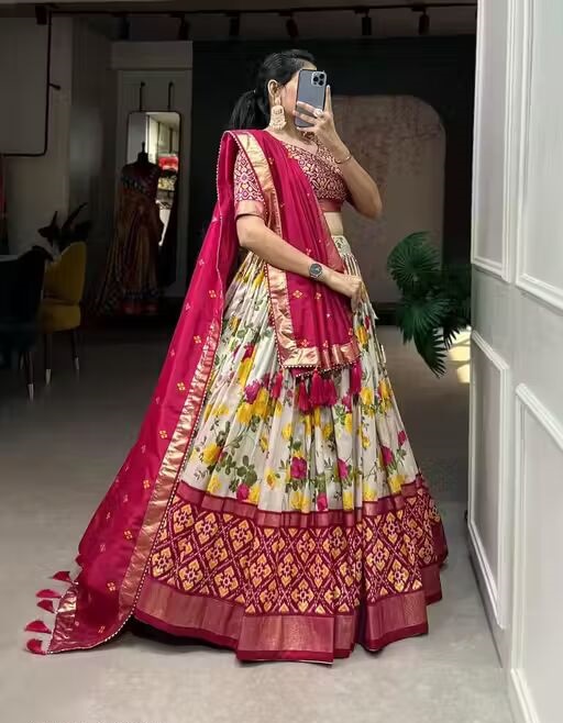 Name : Women’s Tussar Silk Fabric With Bandhni & Patola Print And Foil Work Lehenga Choli For Womens And Girls Canvas and attached with Can Can